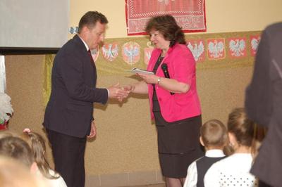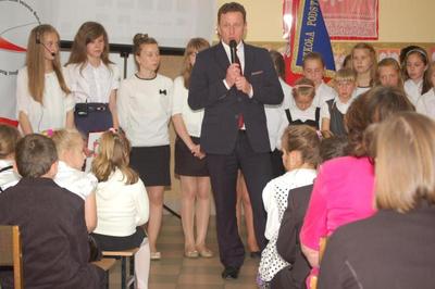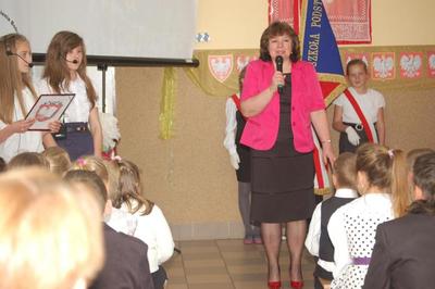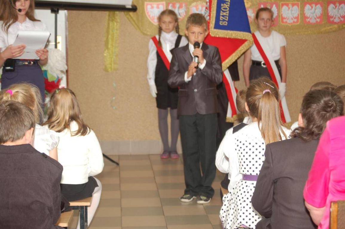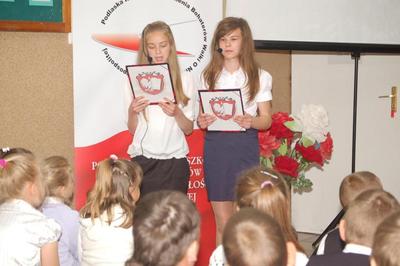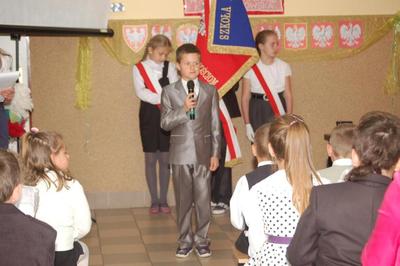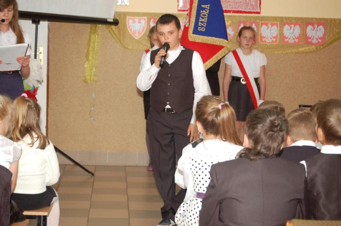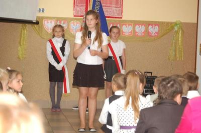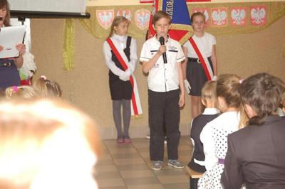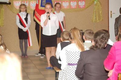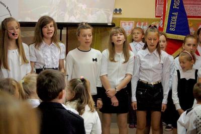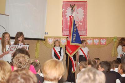 Już po raz szósty społeczność szkolna uczciła rocznicę nadania imienia i sztandaru naszej szkole. O godzinie 8.00 zabrzmiał szkolny dzwonek na dźwięk którego uczniowie i nauczyciele zebrali się przed budynkiem szkoły. Po odśpiewaniu Hymnu państwowego na maszt wciągnięto biało czerwoną flagę, a delegacja Samorządu Uczniowskiego złożyła kwiaty pod tablicą upamiętniającą nadanie Szkole Podstawowej w Wykowie imienia Orła Białego. Dyrektor szkoły Pani Ewa Romatowska przypomniała uczniom historię szkoły, która w obecnym budynku ma swoją siedzibę od 1958 roku. Zwróciła również uwagę zebranych na symboliczne drzewko – buk czerwony, które zostało zasadzone na upamiętnienie roku milenijnego, a którego nazwa została nadana po konkursie przeprowadzonym wśród uczniów. Zupełnym splotem okoliczności nazwa ta jest identyczna jak tytuł hymnu szkolnego czyli Nadzieja. Po tej podniosłej uroczystości uczniowie i nauczyciele rozeszli się do klas na lekcje. O godzinie 11.00 szkolny dzwonek ponownie zgromadził społeczność szkolną na uroczystym apelu. W obecności zaproszonych gości uczniowie przedstawili program artystyczny, który zapoznał zgromadzonych z historią tego najważniejszego dla każdego polaka symbolu - Orła Białego. Historią, która swój początek ma w czasach Bolesława Chrobrego, a po zawiłych ścieżkach prowadziła naszą Ojczyznę, aż ku szczęśliwemu zakończeniu w dniu 31 grudnia 1989 roku, gdy sejm uchwalił ustawę o symbolach narodowych. Montaż słowno-muzyczny zakończyło wspólne odśpiewanie hymnu szkoły „Nadzieja”.
