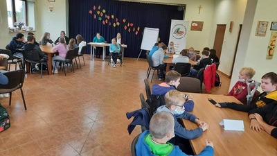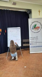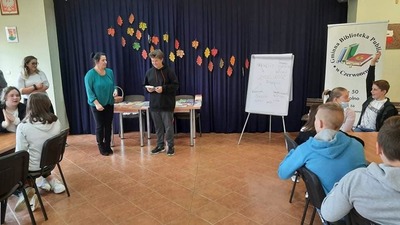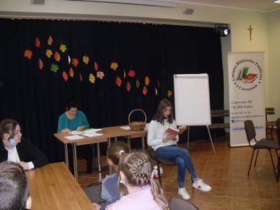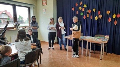 Dnia 6.10.2021r. w ramach innowacji pedagogicznych pt. "Książka moją pasją" uczniowie klas IV-VIII Szkoły Podstawowej im. Orła Białego w Wykowie wzięli udział w spotkaniu czytelniczym zorganizowanym w Gminnej Bibliotece Publicznej w Czerwonem. Głównym punktem programu było wspólne czytanie opowiadania Pawła Beręsewicza pt. "System" I zwrócenie uwagi na wartości, które powinny stale towarzyszyć każdemu człowiekowi. Nasi uczniowie aktywnie uczestniczyli w spotkaniu i już nie mogą doczekać się następnego.