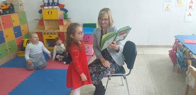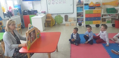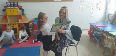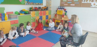 Podczas spotkania dzieci słuchały bajek i odpowiadały na pytania dotyczące przeczytanego tekstu. Dziękujemy