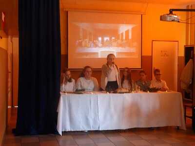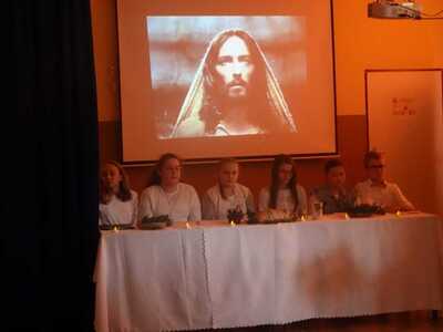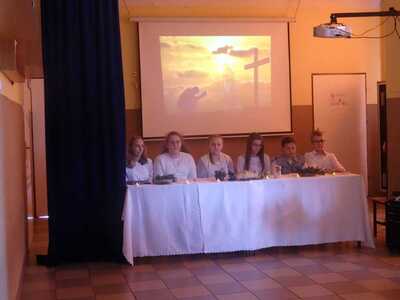Z okazji zbliżających się Świąt Wielkanocnych uczniowie klasy V i VI pod opieką Pani Katarzyny Kalinowskiej przygotowali krótki występ pt. "Czy Bóg oszalał z miłości?", który wprowadził nas w nastrój zadumy i refleksji, a także przypomniał o istocie Świat Wielkanocnych.