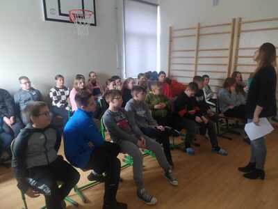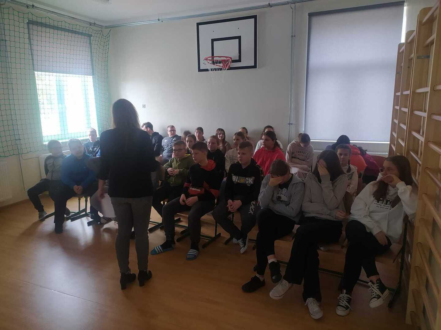 Uczniowie wysłuchali z zainteresowaniem pani psycholog prowadzącej prelekcję. Z zaciekawieniem zadawali pytania i dowiedzieli się o skutkach uzależnień oraz niebezpiecznych zachowań.