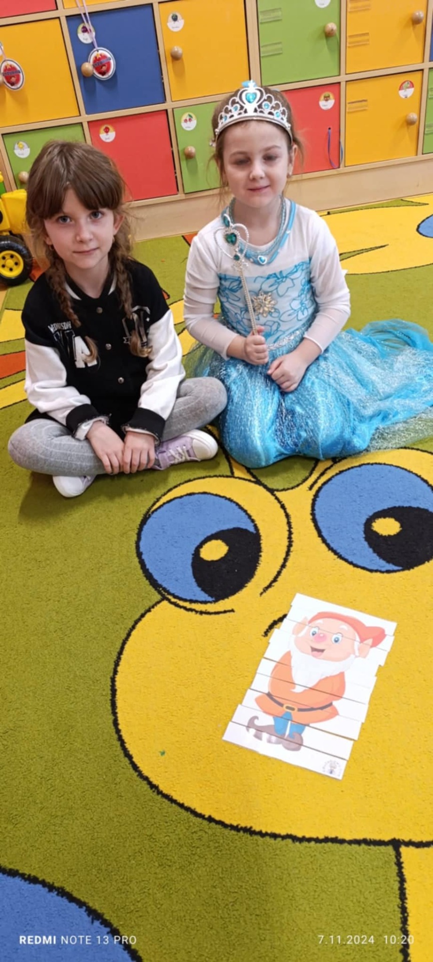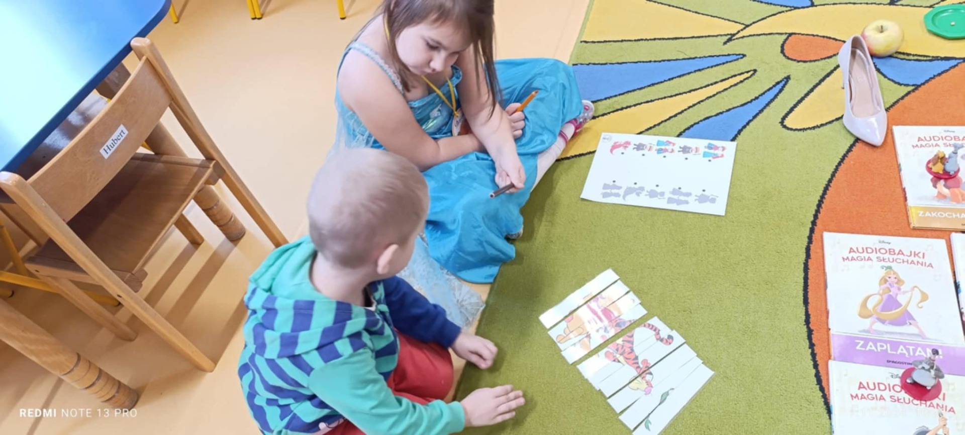 Trafnie rozpoznały bajkowe rekwizyty oraz układały ,,bajkowe" puzzle.