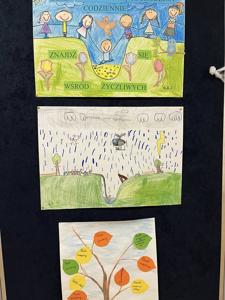 Technika wykonania plakatu była dowolna. Ponadto podczas przerw uczniowie rozszyfrowali zagadkowe stacje zadaniowe oraz wręczali sobie życzliwe zrywki życzliwych emocji.