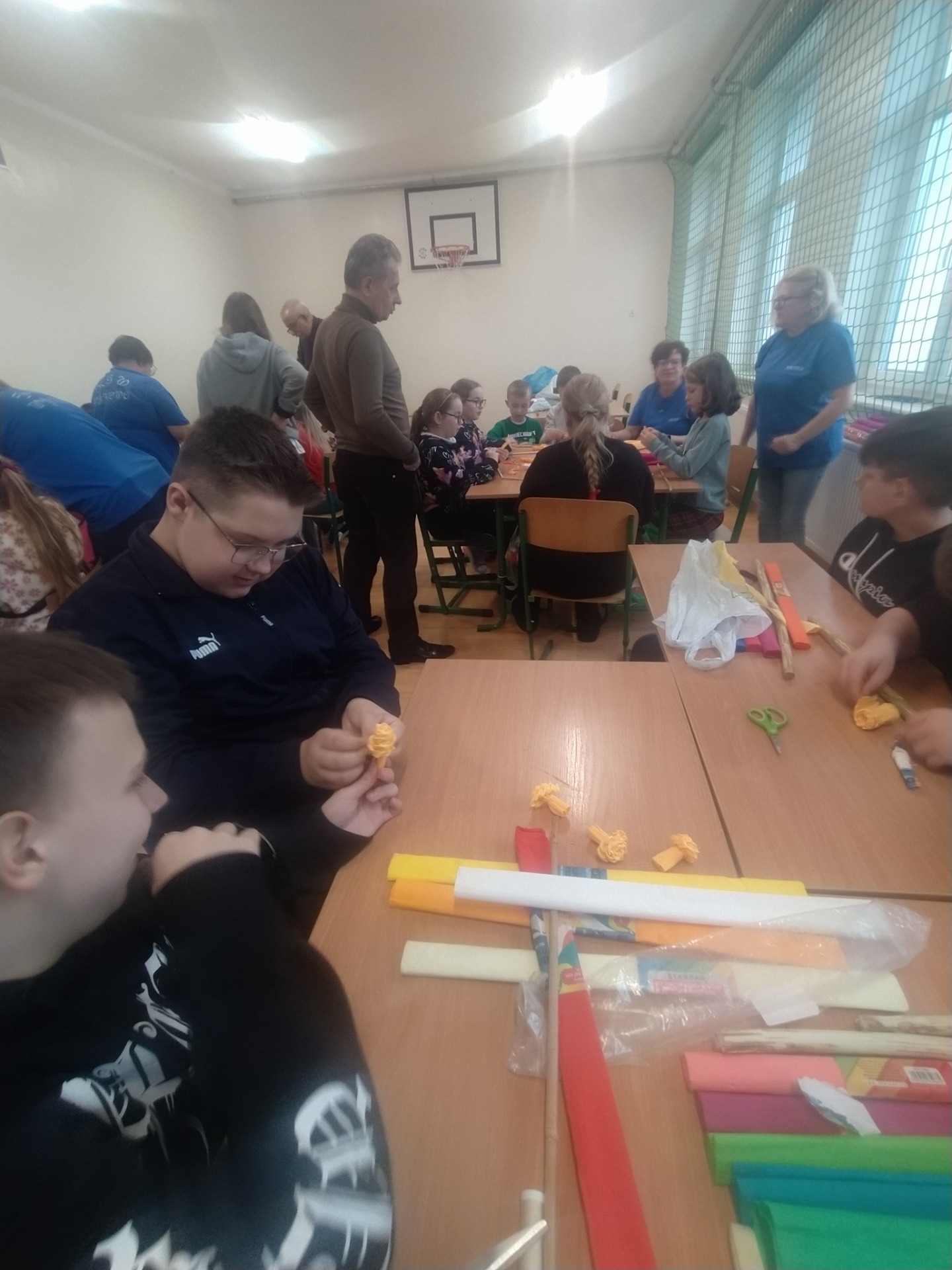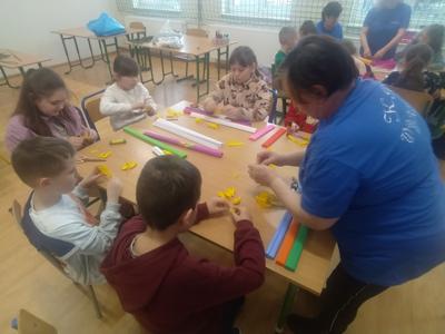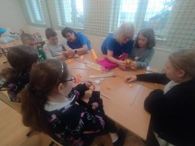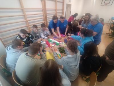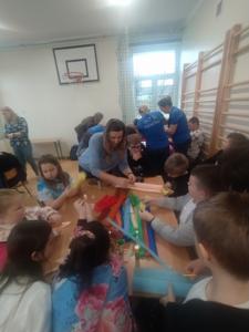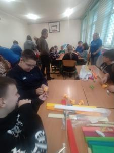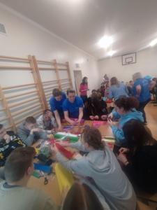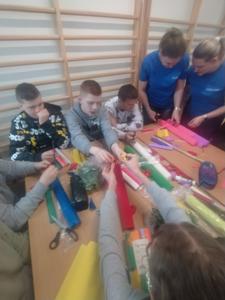 i doskonalenie umiejętności współpracy. Prowadziły je dla nas panie z Koła Gospodyń Wiejskich z Wykowa. Podczas warsztatów każda klasa wykonała tradycyjną palmę wielkanocną. Na zajęciach panowała miła i radosna atmosfera. Wszyscy wspaniale się bawili w trakcie wspólnej pracy.